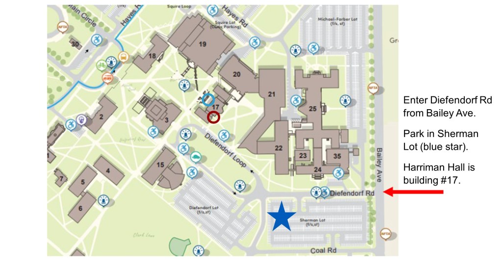 On the day of the Summit, attendees may park in the Sherman Lot (only) without a parking pass. Accessible parking spaces are available in the Diefendorf Loop; however, note that a pass/meter payment will be required to park in lots other than Sherman.
